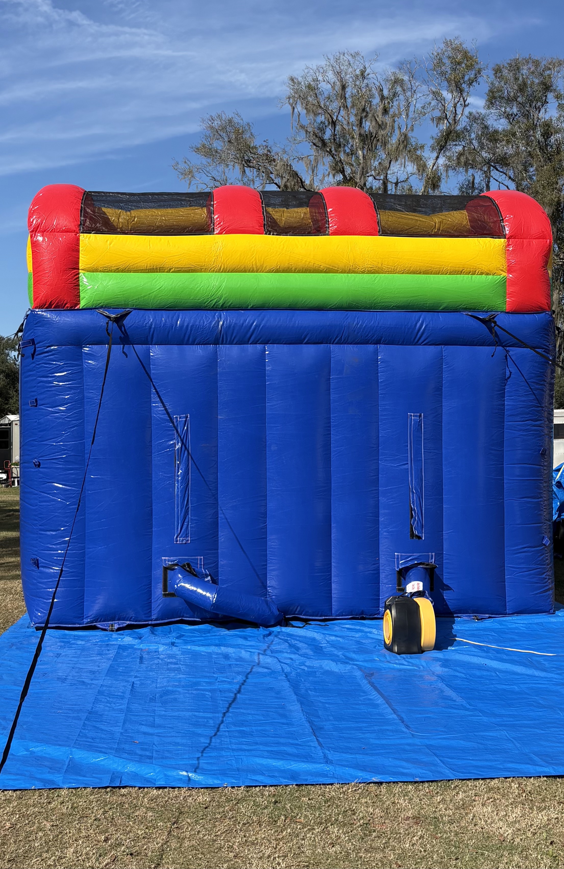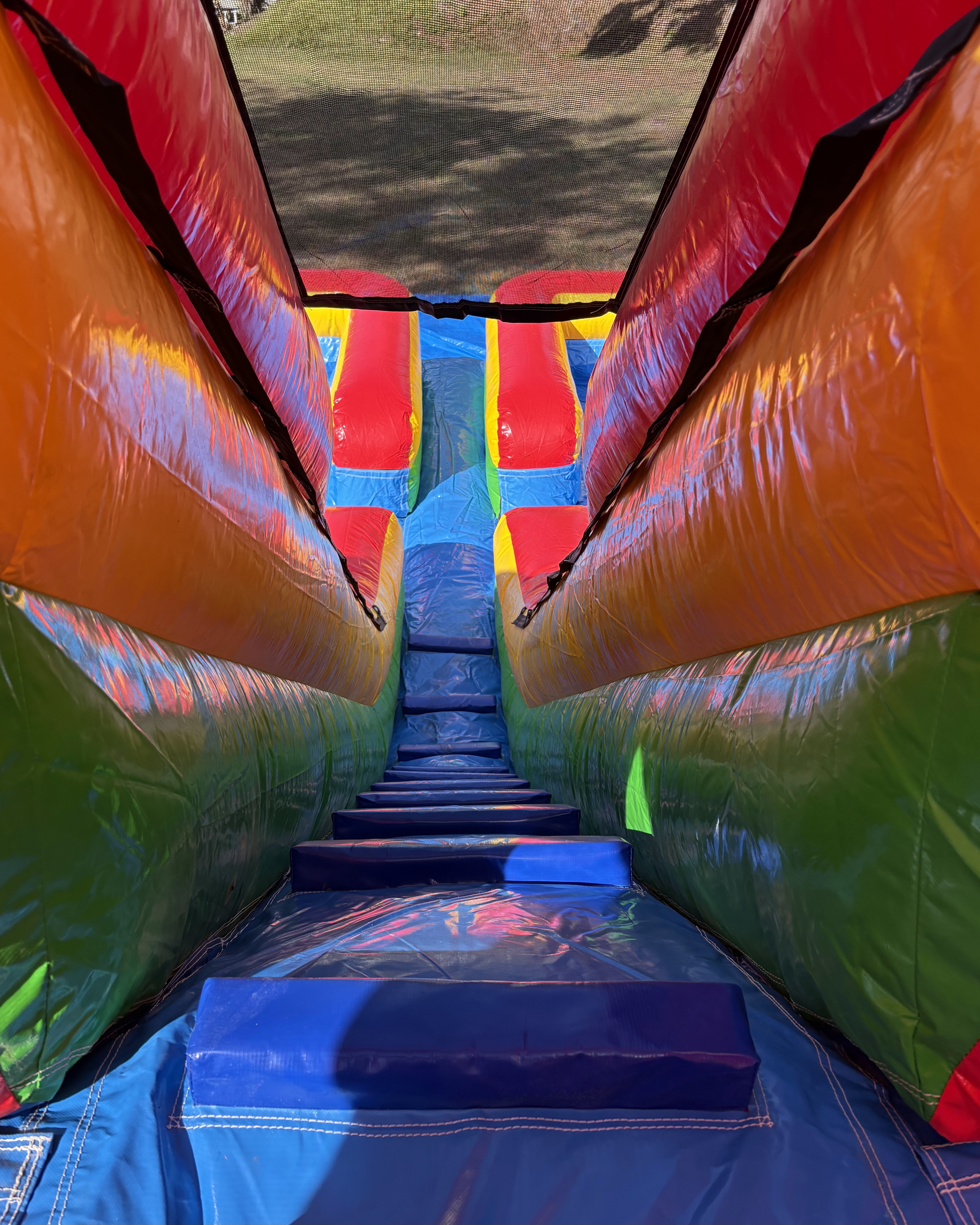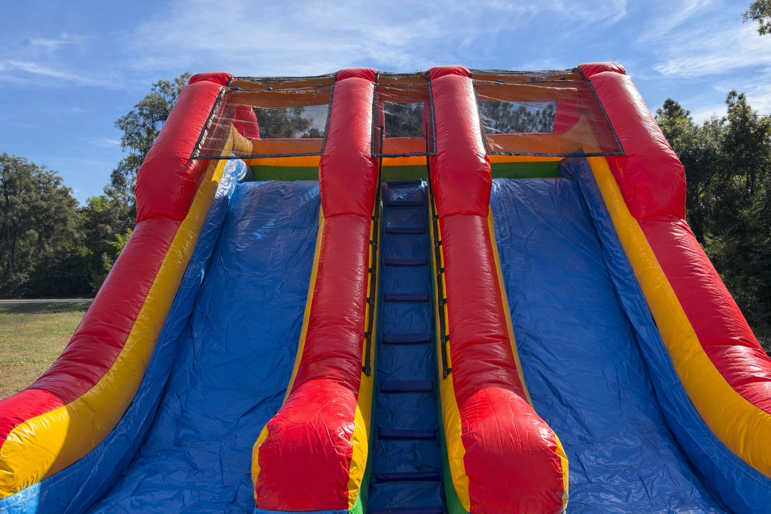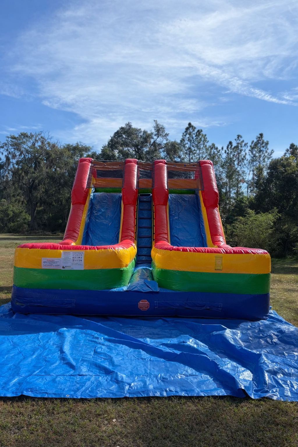 Beat the Florida heat and get ready to turn your backyard or event into a waterpark. This slide features two towering lanes so that you can race head-to-head and finish with a giant splash! This slide also features a covered climbing ladder with special weave safety netting; This netting design keeps fingers safe and lets riders climb all the way to the top without worry
