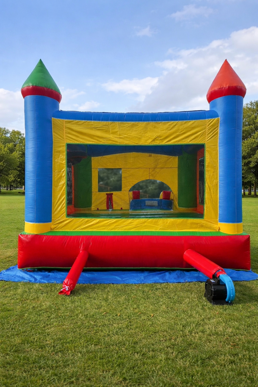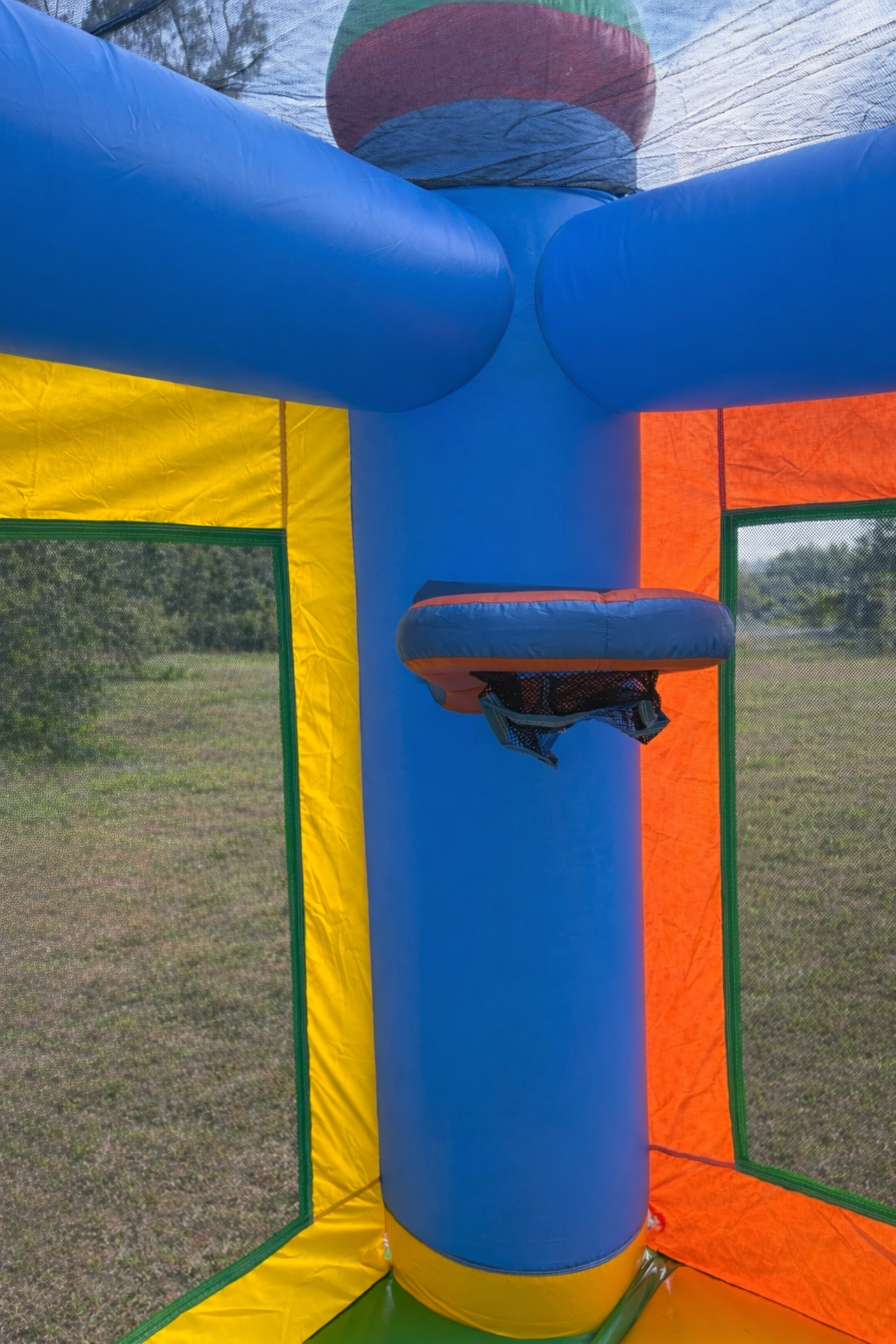 The bounce house portion features a basketball hoop (two balls incl.) and a safety step for easy entry/exit. It also features special safety netting to keep fingers safe and your view of the bouncers unobstructed.