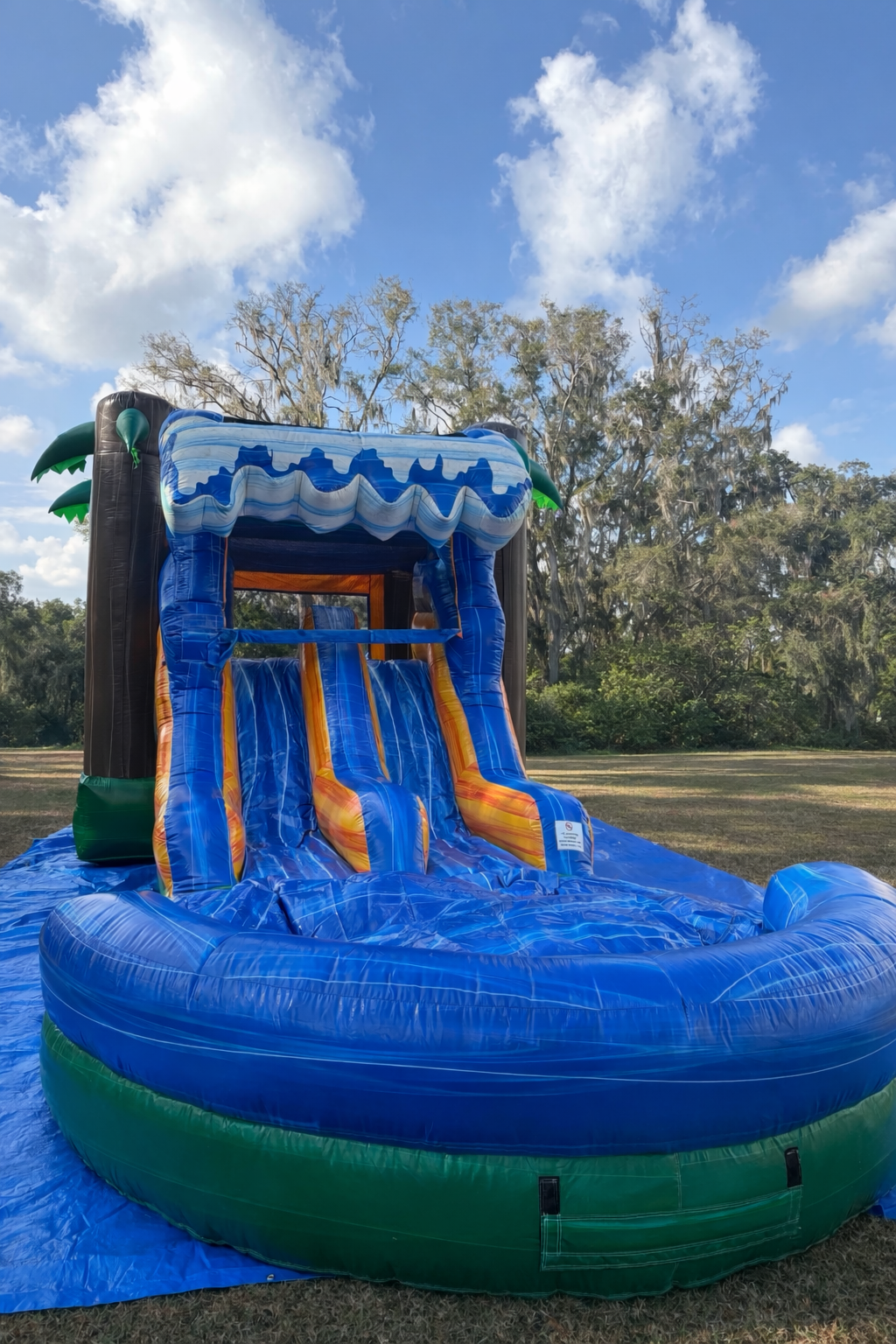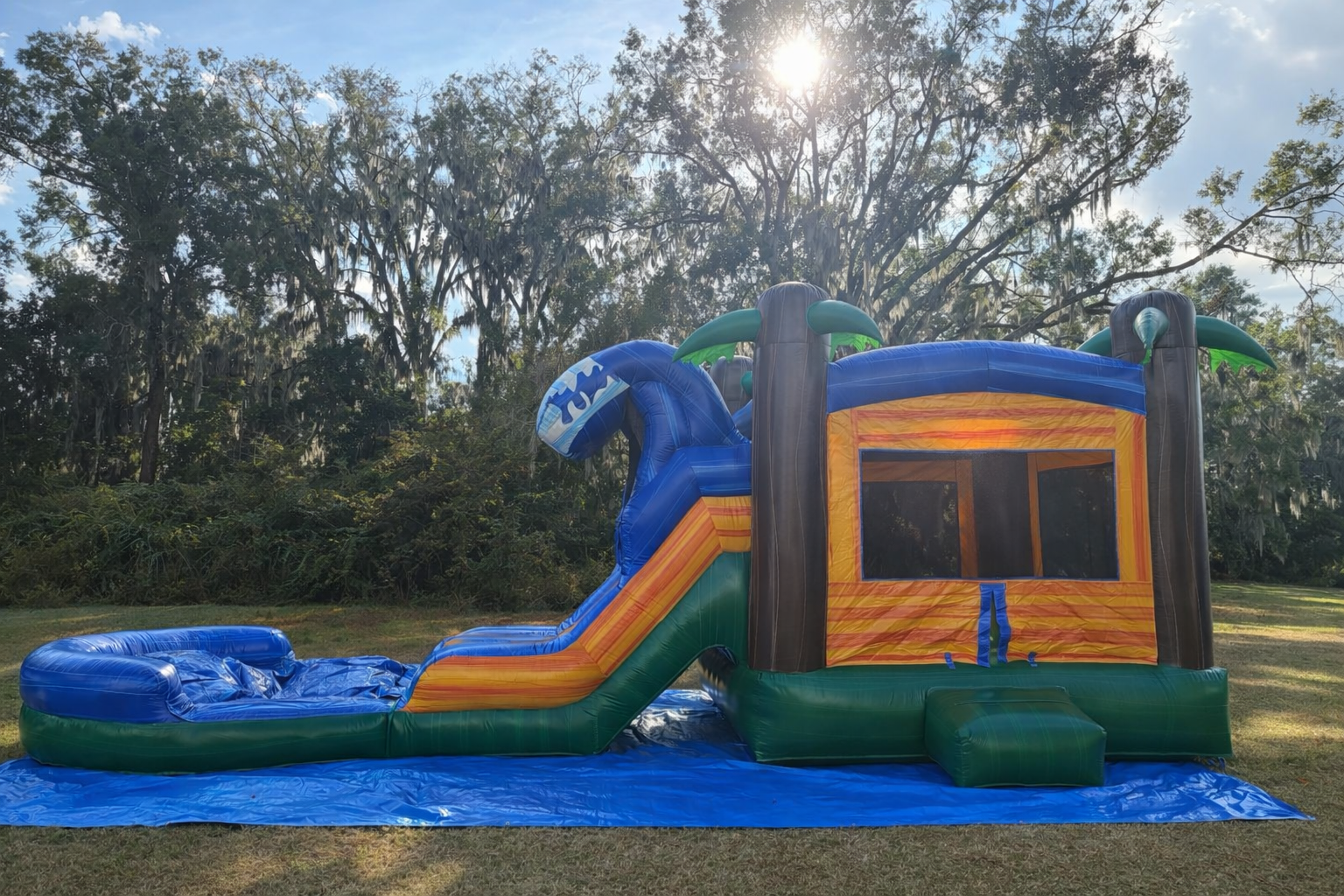 Enter a tropical paradise with this bounce house and dual waterslide combo.